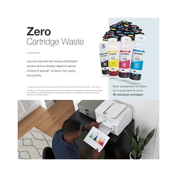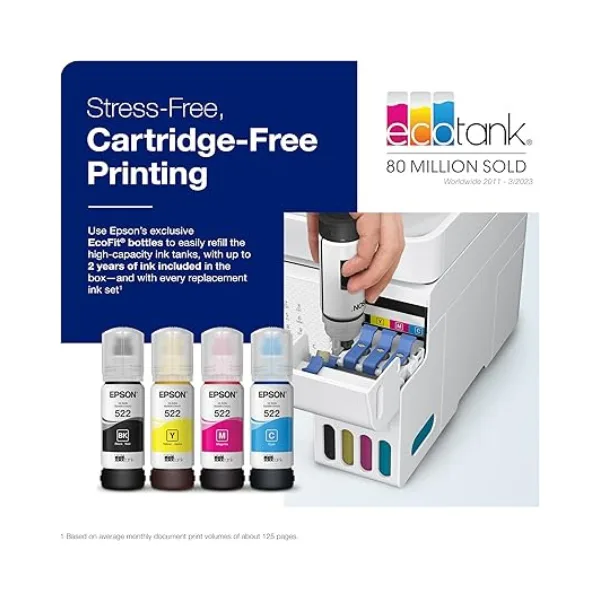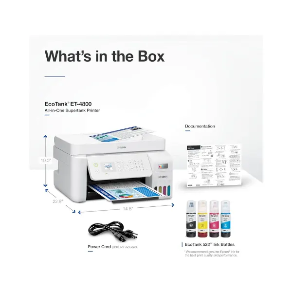 Included Components: EcoTank ET-4800 all-in-one, Manual, CD-ROM for Product Setup, Power Cord, 1× Bottle 522 Black (65 mL), 1× Bottle Each 522 Cyan, Magenta, Yellow (65 mL)