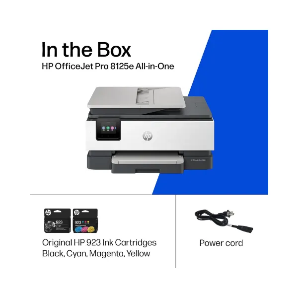 Included Components: HP OfficeJet Pro 8125e All-in-One Printer; HP 923 Setup Black Ink Cartridge; HP 923 Setup Cyan Ink Cartridge; HP 923 Setup Magenta Ink Cartridge; HP 923 Setup Yellow Ink Cartridge; Power Cord; Regulatory Flyer; Ink Caution Flyer; Setup Poster; Reference Guide