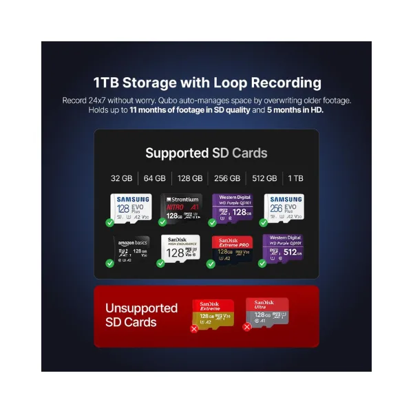Included Components: Qubo Smart Cam 1N, Power Adapter (5V/1A) 1N, Warranty Card 1N, Cable 1N, Screw Kit 1N