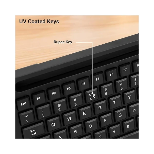 - The keyboard boasts 106 keys with UV-coated keycaps strategically positioned for optimal typing comfort and efficiency, catering to both work and leisure needs. Additionally, the inclusion of a Rupee key reflects regional inclusivity.